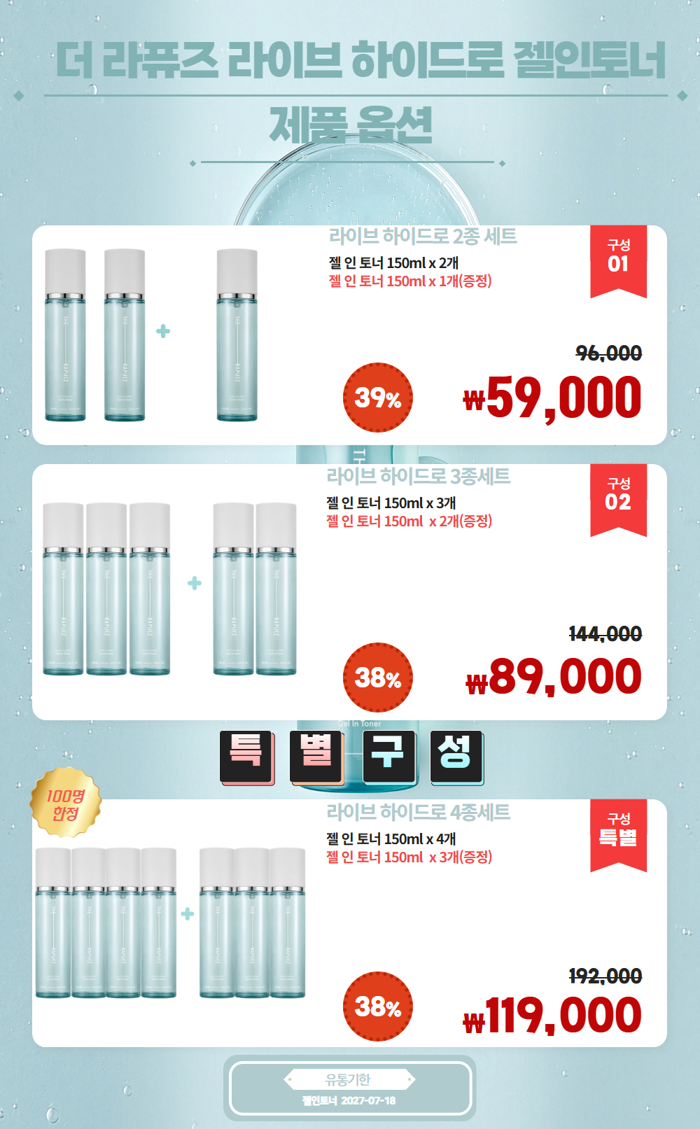 정제수, 나이아신아마이드, 펜틸렌글라이콜, 글리세린, 메틸프로판다이올, 프로판다이올, 1,2-헥산다이올, 아이리쉬모스추출물, 클로렐라 불가리스추출물, 사탕수수추출물, 자일리틸글루코사이드, 자일리톨, 소듐하이알루로네이트, 하이드롤라이즈드하이알루로닉애씨드, 하이알루로닉애씨드, 다이프로필렌글라이콜, 글루코오스, 아크릴레이트/C10-30알킬아크릴레이트크로스폴리머, 폴리글리세릴-10라우레이트, 트로메타민, 부틸렌글라이콜, 프룩토올리고사카라이드, 프룩토오스, 에틸헥실글리세린, 다이포타슘글리시리제이트, 아데노신, 안하이드로자일리톨, 알란토인, 소듐파이테이트, 판테놀, 올리고펩타이드-210에스에이치-데카펩타이드-10시스테인, 베타인, 토코페롤, 벤질글라이콜, 하이드롤라이즈드글라이코사미노글리칸, 글루코노락톤, 하이드록시프로필트라이모늄하이알루로네이트, 소듐하이알루로네이트크로스폴리머, 소듐아세틸레이티드하이알루로네이트, 하이드롤라이즈드소듐하이알루로네이트, 포타슘하이알루로네이트, 향료