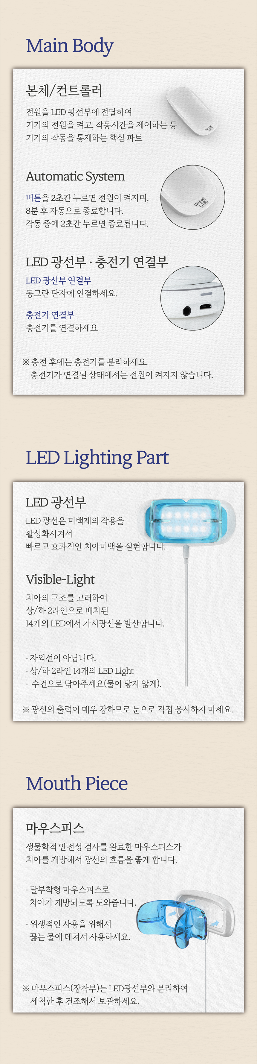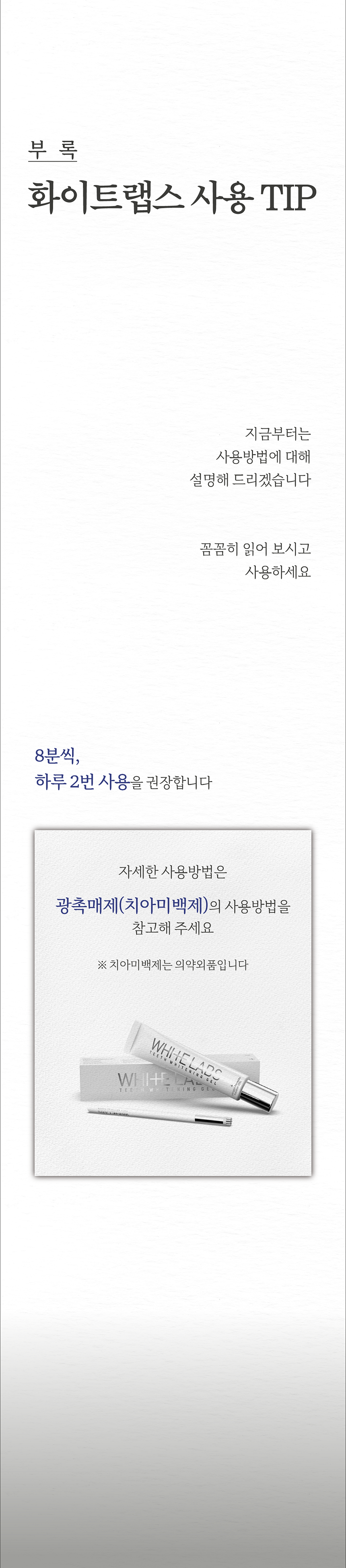 치아미백 / 1. 8분씩 하루 두번 사용하세요 2. 15일~30일 동안 사용하세요. 3. 1년쯤 지나서 치아가 변색되면 그때 다시 15일~30일 동안 사용하세요.